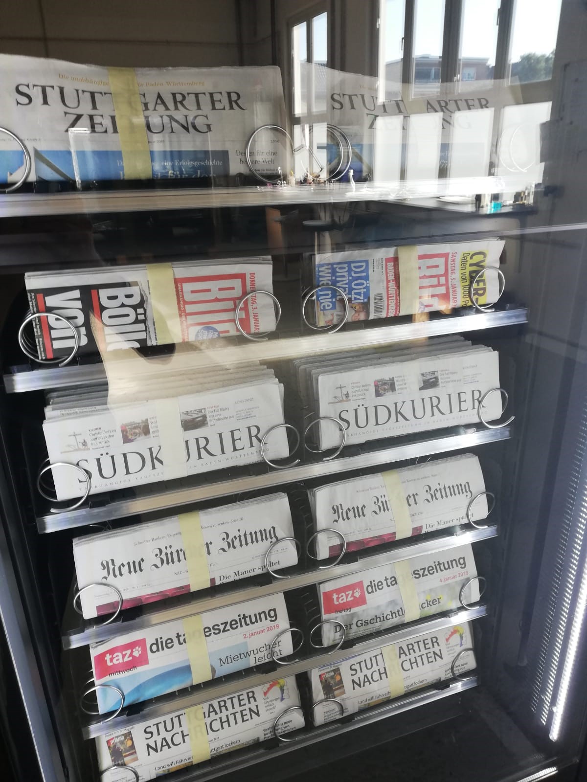 Mit den Zeitungsautomaten erhalten Ihre Kunden die druckfrischen Nachrichten zu jeder beliebigen Uhrzeit. Besonders beliebt bei Pendlern sind auch in der digitalen zeit haptische Zeitungen mit News über Lokales, Sportliches, Politisches und Kulturelles. Unsere Zeitungsautomaten können Zeitungen in den gängigen Formaten Rheinisches, Nordisches und Berliner Format transportieren.
